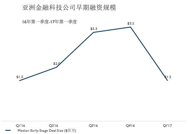 2017年第一季度,亚洲金融科技公司获得的早期融资环比持平。