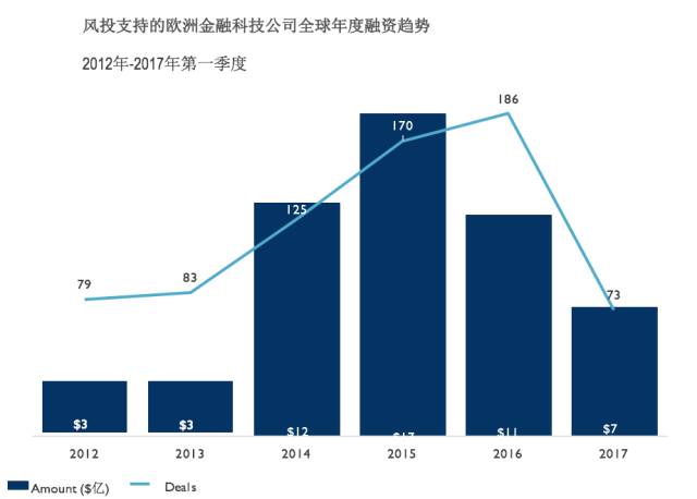 在2017年第一季度,欧洲风投支持的金融科技公司在73个交易中筹集6亿6千7百万美元投资