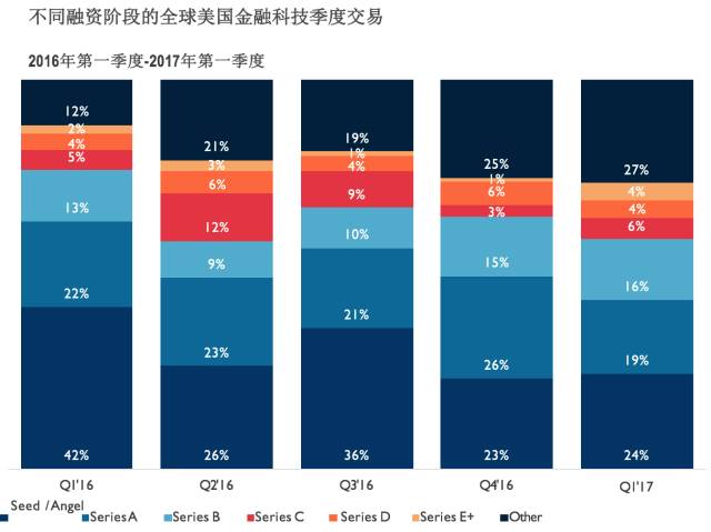 种子轮融资交易份额在美国金融科技中相比2016年第四季度没有显著地下降或者上升。