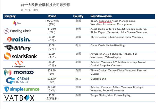 2017年第一季度,欧洲前十大金融科技公司融资额度合集超过4.05亿美元。