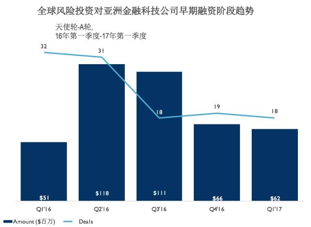 2017年第一季度,亚洲金融科技公司获得的早期融资约为620万美元,合计18笔融资交易,略少于上一季度。