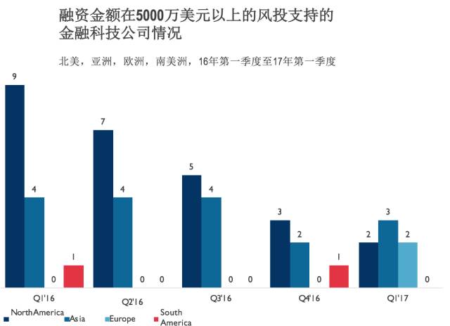 2016年欧洲没有公司(针对风投支持的金融科技公司)获得投资额在5000万美元以上的融资。2017年第一季度欧洲有两家风投支持的金融科技公司获得1亿美元的投资。