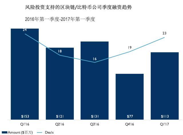 在16年第四季下降到7千7百万美元之后,对风险支持的比特币和区块链新兴公司的投资在17年第1季度回升到1亿1千3百万美元。2017年第一季度最大的一笔交易为BitFury 的3千万美元C轮融资和Veem的2千4百万美元B轮融资。