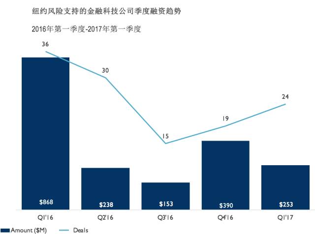 纽约金融科技交易活动相比2016年第四季度环比上升了26%,但是与去年同期相比下降了33%,其中包括了对Oscar和Betterment的大笔融资。