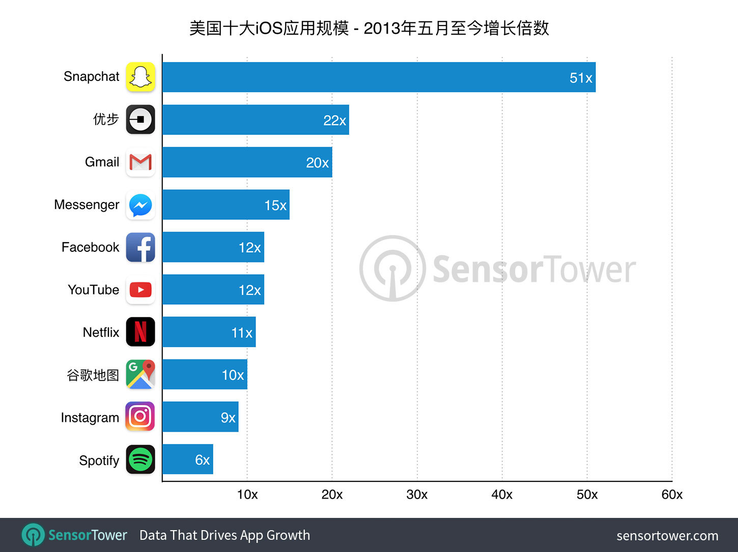 美国最受欢迎的十大iPhone应用中,2013年五月至今规模增长最小的为Spotify,是四年前占据空间量的六倍。如上图所示,其他应用,尤其是Snapchat,规模都增加了更多。