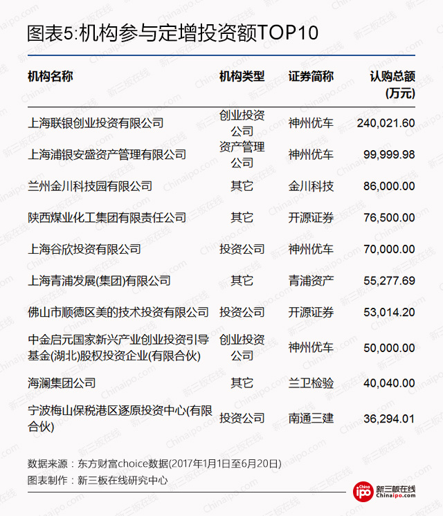 新三板在线注意到,机构除了偏好参投与自身业务相关的标的实体公司外,今年以来投资额前十的机构中,4家机构都投给了神州优车(首次定增项目)这样的龙头企业。
