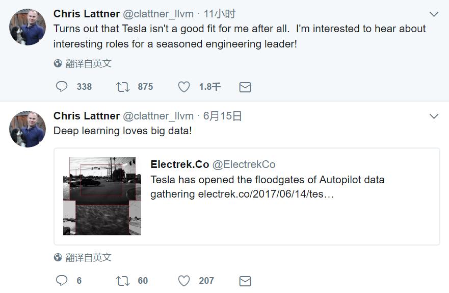 任期不到6个月,Chris Lattner的离职似乎有些仓促,他今天通过Twitter宣布:“事实证明我和特斯拉不是很合拍,我正在寻求技术管理的新职位。”