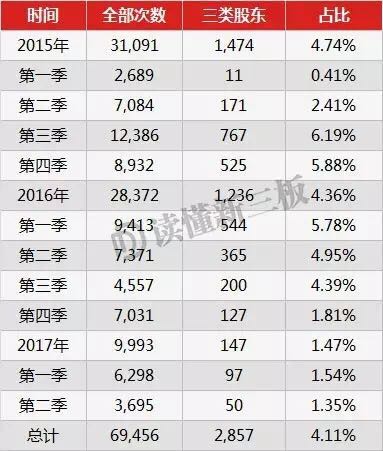需要提醒的是,因为读懂新三板研究员统计的数据来源之一为交易异动信息公开的数据,三类股东的真实接触面远不止22.45%。