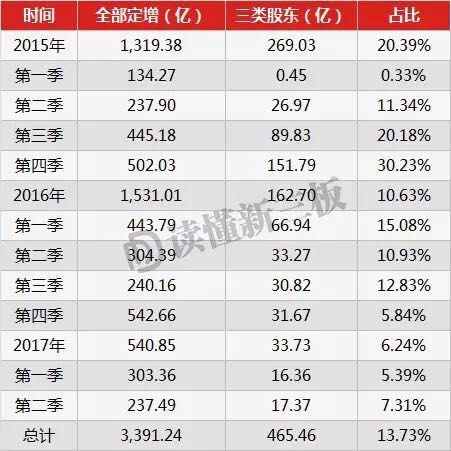 2.2015年1月1日至2017年6月11日,三类股东参与了2857次定增,贡献了465.46亿元,占市场认购总额的13.73%;