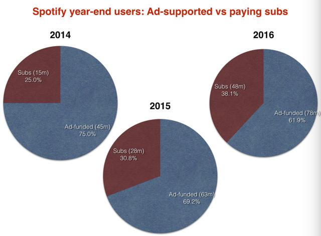 但在对2016年Spotify用户进行分析时,我们发现,即使Spotify在全球音乐流媒体中付费用户转化率最高,但免费用户占比仍高达61.9%,一大半用户都是免费用户。于是,难怪Spotify将目光转向这数量众多的免费用户。