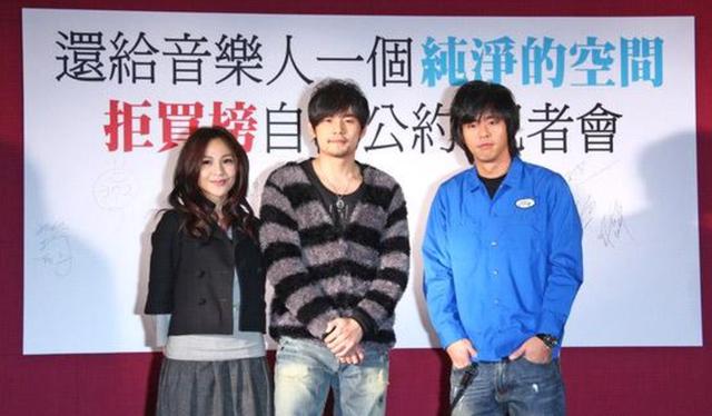 2009年,周杰伦、梁文音、柯有伦参加拒买榜自律公约记者会