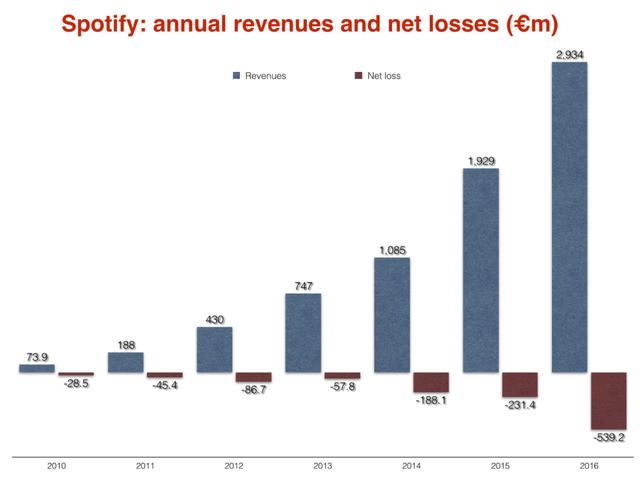 据2016年财报显示,Spotify在过去一年里收入增加了52%,总收入高至33亿美元。但让Spotify坐立难安的是,其年净亏损也增加至5.97亿美元。
