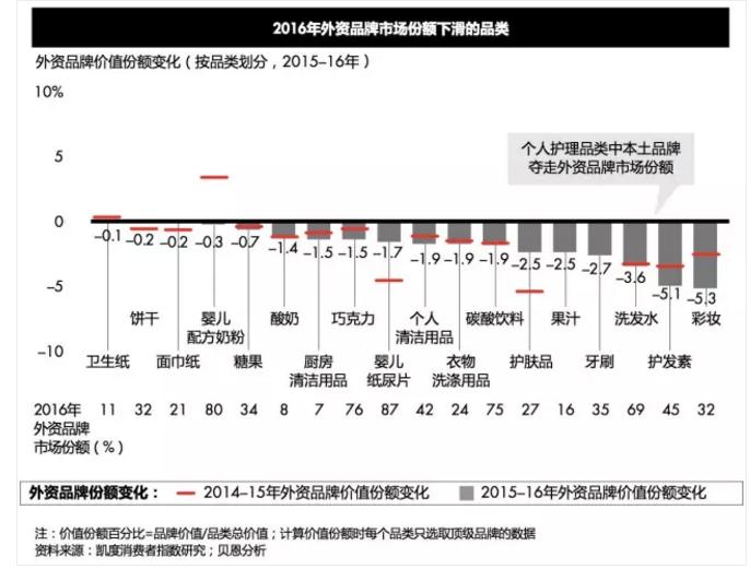 尤其是在外资占主导的化妆品、护肤品和个护领域,中国本土品牌正在追赶上来,而外资品牌市场份额连续两年倒退。