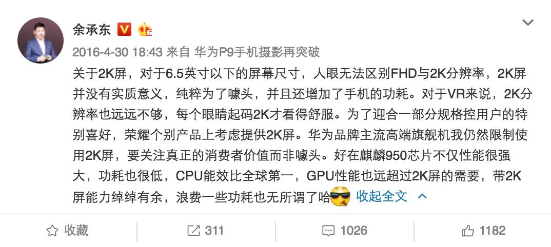 华为品牌主流高端旗舰机限制使用2K屏。 —— 余承东,2016年4月。