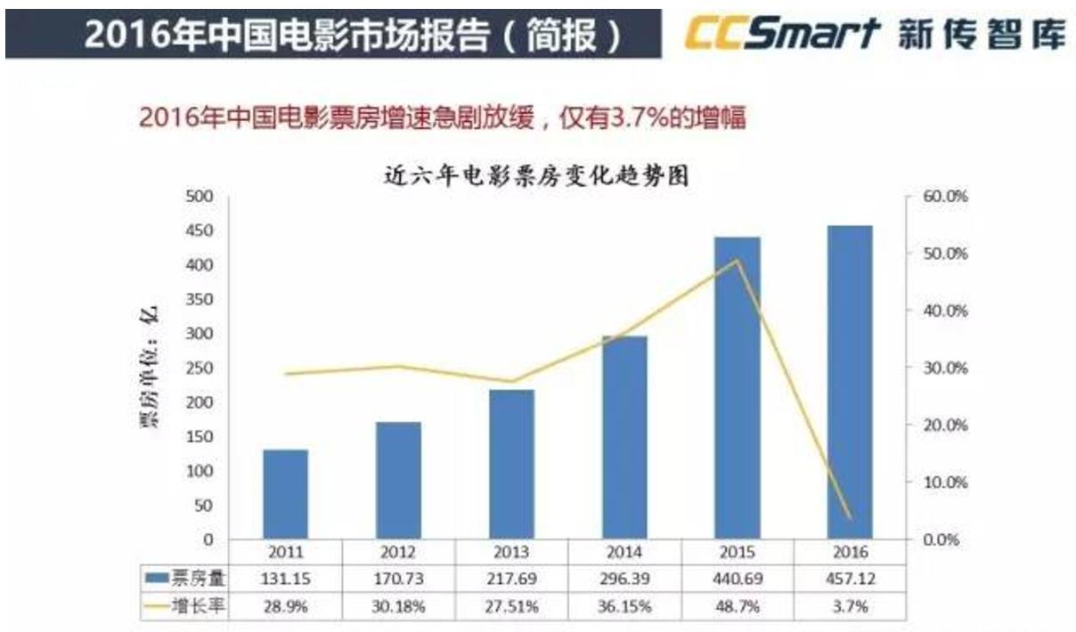根据国家新闻出版广电总局电影局的数据显示,2016年全年全国电影总票房457.12亿元,同比增长仅3.73%,持续多年的高速增长遭遇“急刹车”,远低于王健林所判断的15%。