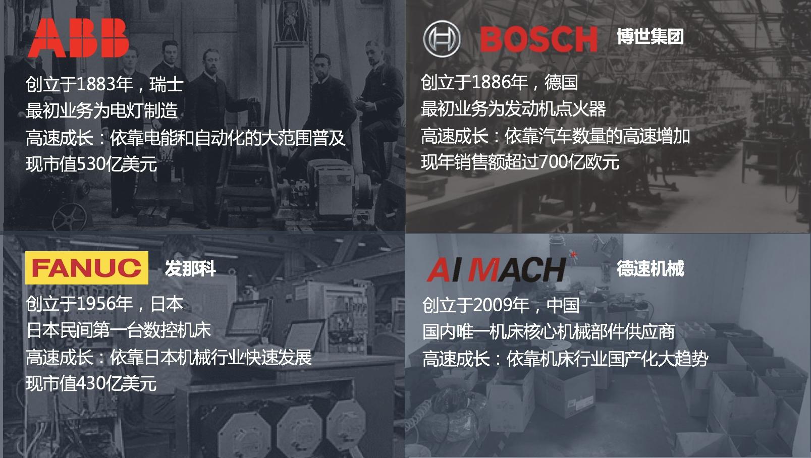 左边那一家是ABB,当年做的是电灯,现在做电能和自动化,市值530亿美金。下面小的仪器公司,就是法那科公司,日本民间第一台数控机床,现在市值400多亿美金。右上角叫博世,这个我相信汽车行业或者汽车零配件的同仁应该都有耳闻。这是隐形的巨头,没有上市,但是一年销售700亿欧元,今天的自动驾驶领域,他们也有非常多的投资布局。右下角是我们投的江苏德速机械,这一张看的不是特别清楚,这一张图大概是两年半前,我们投资经理访谈这一家公司以后,项目过会的时候放了这一张图。