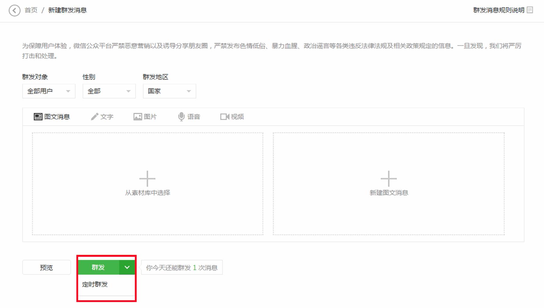 具体怎么操作,相关用户可以参看微信官方指南。虽然定时推送会为内容运营者带来极大的便利,但很多问题也相伴而来,比如设定发送的文章,已经被别的公众号抢先申请了原创;以及如何取消定时群发等。在微信官方文章里,都有详细的解答。