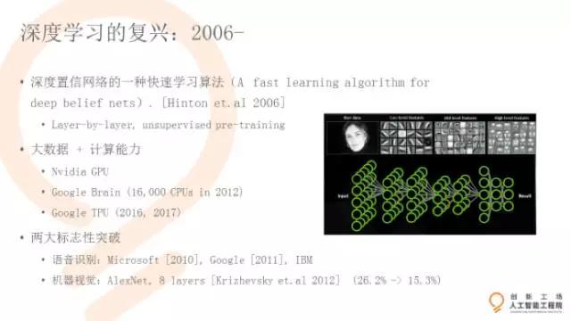 当2006 年之后,深度学习发生了复兴,我们在语音识别和模式识别上发生了突破,尤其是AlphaGo在围棋上取得了这么好的成绩,所有人都会问一个问题,第三次人工智能的浪潮会不会像前两次那样很快跌入低谷?做技术的人知道2012年的卷积神经网络是什么样的,知道它从一个什么样的层面发展到了另一个什么样的层面,比如它在2015年参加ImageNet大赛时已经达到了152层。从结果上看,机器的视觉能力已经突破了人眼的能力极限。在这样的场景下,今天的人工智能可以满足人的需要,这才是第三次热潮和前两次的本质的不同。我们从技术的角度可以下这样一个结论:今天的人工智能才是真正有用的人工智能。我们并不是否定前几十年大师的研究成果,我们是说直到今天,人工智能才达到了人的一个心理阈值,才真正能够具备商业价值。