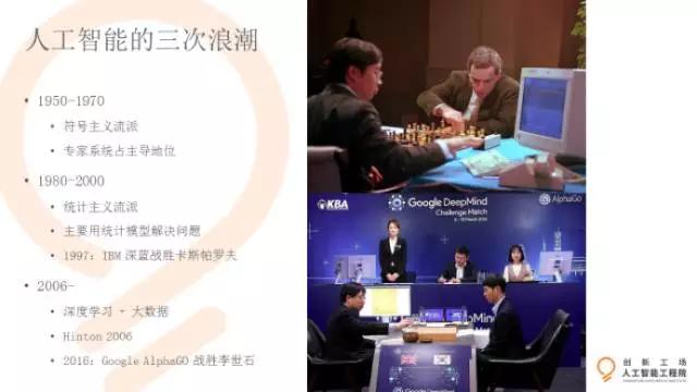 人工智能历史上有三次热潮:第一次浪潮是在人工智能刚提出的十几年,产生了非常多的流派,现在都成为了历史,只有一个连接学派变成了最火的深度学习。第二次浪潮的时候,出现了深蓝,在1997年战胜卡斯帕罗夫那一年,当时我也非常震撼,有点像你们在学校看到AlphaGo一样的感觉,我们当年没有这么多报道,我还花了很大的精力去查深蓝相关的论文和实现方法。