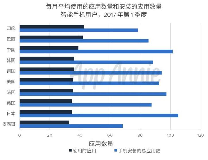 在分析的 10 个国家/地区,用户平均每月使用超 过 30 款应用 (详见下图),平均每天使用超过 9 款 应用。