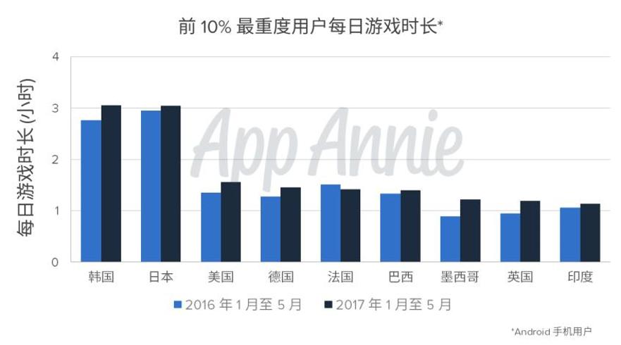 就每名用户的使用时长而言,日本和韩国的移动游戏玩家远超过其他国家/地区的用户
