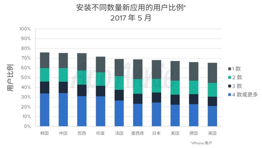 用户下载应用的频率依然很高。在分析的所有国家/地区,2017 年 5 月有超过 65% 的用户至少安装了 1 款应用。