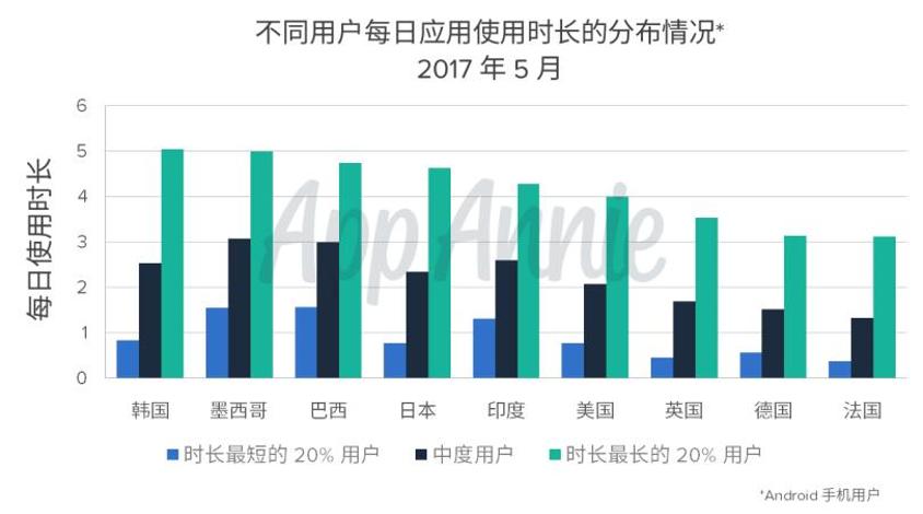 韩国、墨西哥、巴西、日本和印度,应用使用时长最长的前 20% 重度用户每天使用超过 4 个小时。
