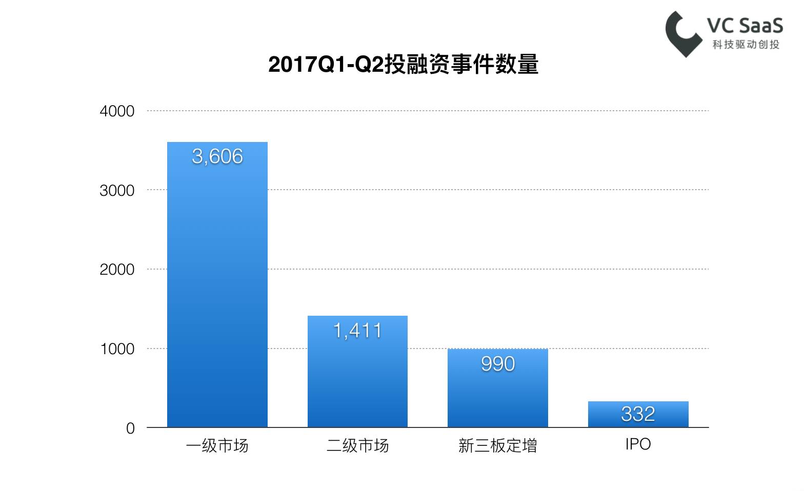 2017年前两季度国内投融资事件共发生了6339件其中涉及一级市场投融资事件有3606起,二级市场融资事件1411起,其中二级市场涵盖新三板定增990起,A股IPO上市企业332家。