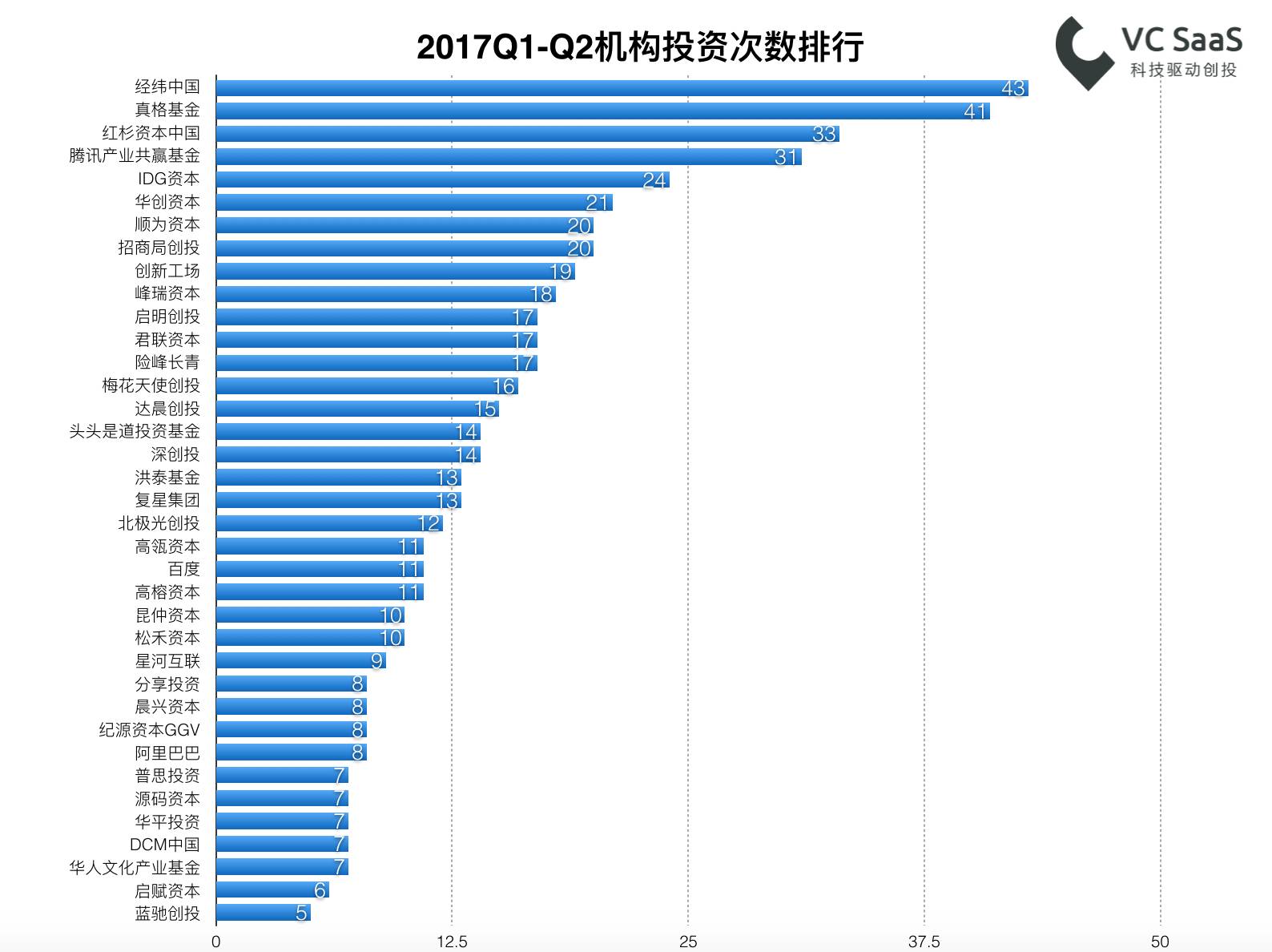 经纬中国是2017前半年最为活跃的投资机构,共计投资事件43起。主要投资方向为企业服务、医疗健康、电子商务、金融。