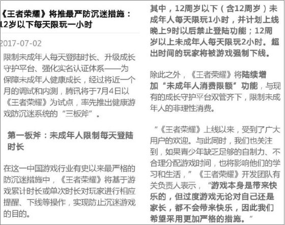 今年春节过后不久,腾讯就推出了“腾讯游戏成长守护平台”系列服务,协助家长对未成年人子女的游戏账号进行健康行为的监护,这是国内互联网游戏行业首个面向未成年人健康上网的系统解决方案。不过,这一系列服务并非单独针对《王者荣耀》而推出,而是面向腾讯旗下所有游戏。同时在措施上不够严厉,比如对未成年人的时长限制不止一个小时,再比如可以通过多账户登录破解。因此,这一系列服务必须同步升级才能有效管控未成年人沉迷游戏这个日益严重的问题。