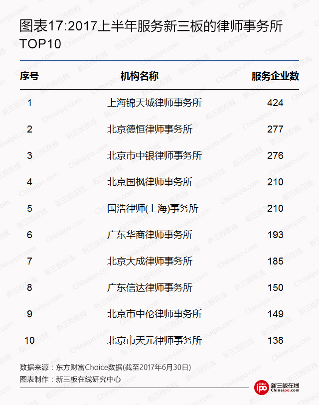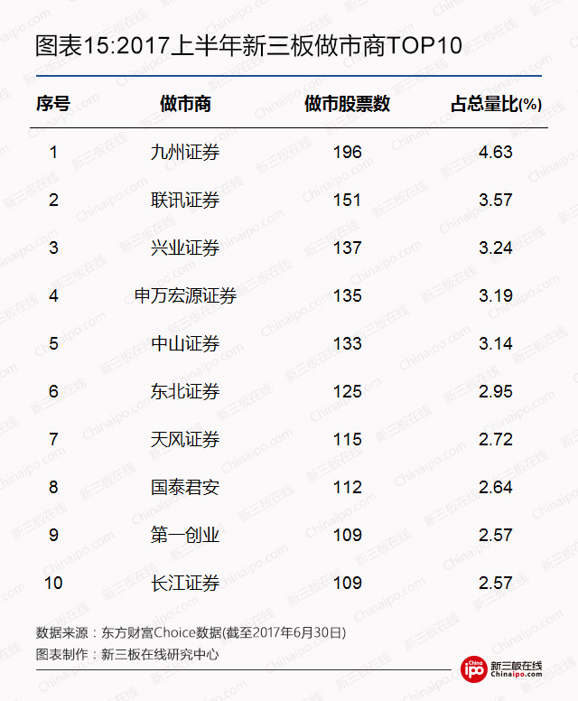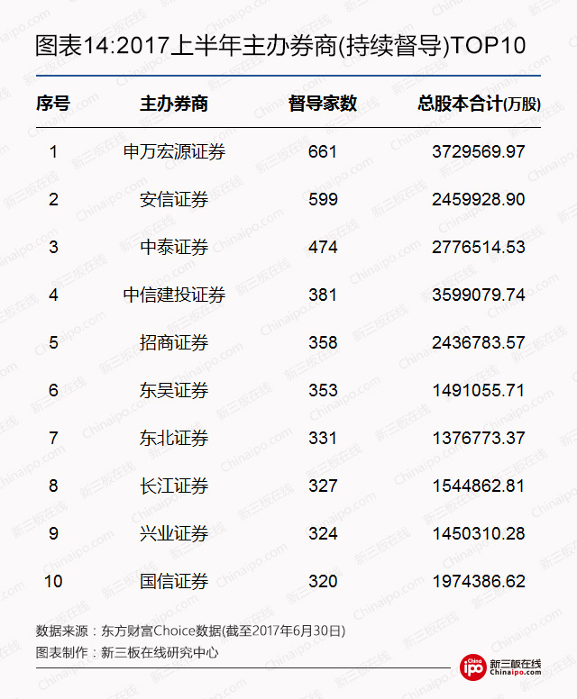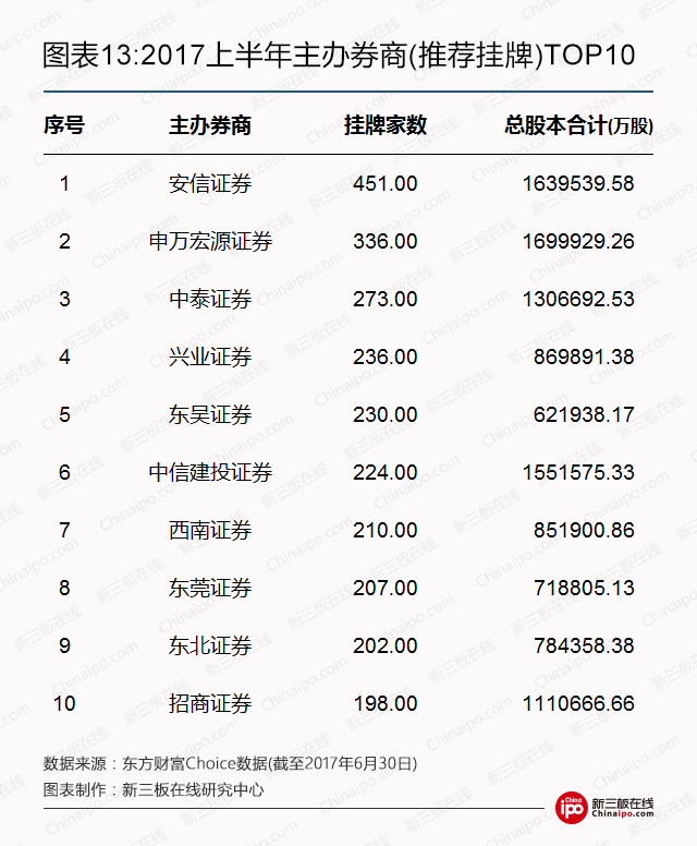 新三板在线研究中心统计发现,截至2017年6月30日,安信证券成功推荐451家企业,成为新三板上推荐企业最多的主办券商;同时申万宏源证券是新三板上持续督导,以服务661家挂牌企业居首。