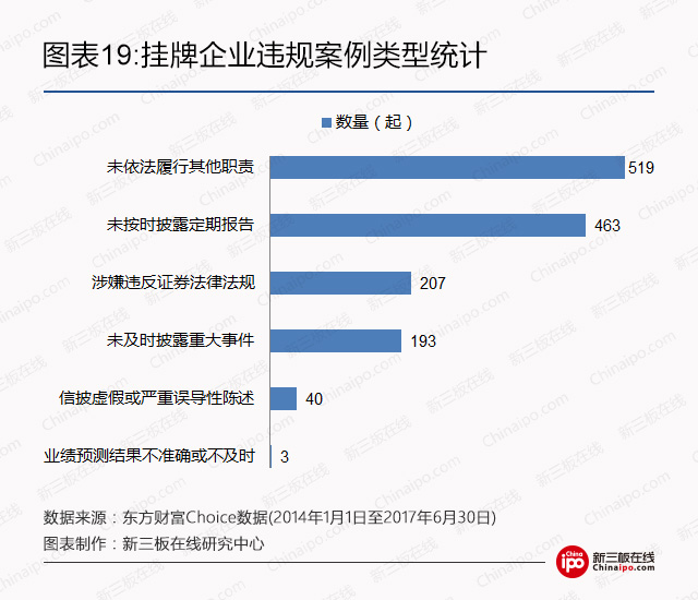 从股转系统对挂牌公司开出的罚单类型看,数量最多的是“未依法履行其他职责”,涉及该类处罚案例519起;其次是“未按时披露定期报告”,有463起;再是“涉嫌违反证券法律法规”,有207起。