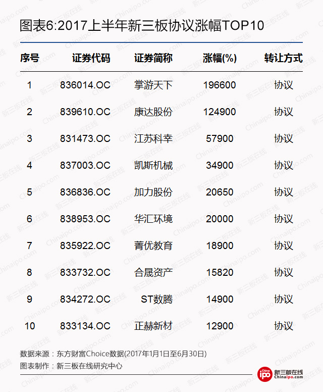 2017年上半年新三板协议股票的整体股价涨幅为78.01%,远超做市股票,其中掌游天下以196600%的涨幅成为股价涨幅最高的协议转让三板股。