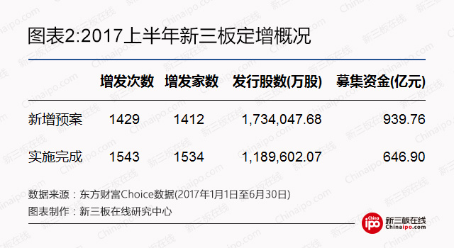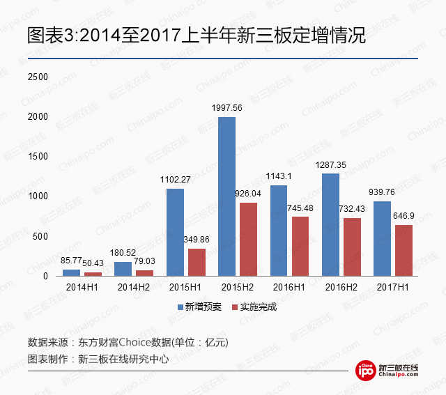 2017年上半年新三板共完成1543次定增共募集资金646.9亿元。同时,这半年的新增定增预案1429次,拟募集资金939.76亿元。通过对比2014至2017年定增情况可以发现,2017年上半年定增情况继续遇冷。