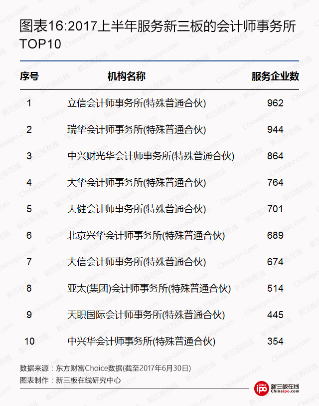 此外,九州证券参与196家挂牌企业做市,是最喜欢参与新三板做市的机构。而立信会计师事务所服务了962家企业,是最受新三板公司信赖的审计机构。