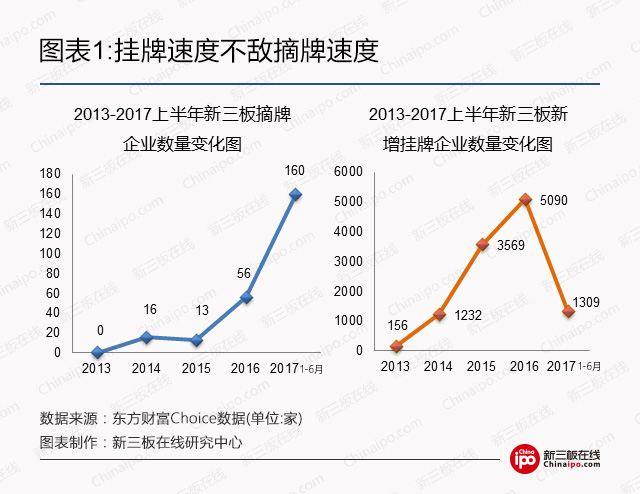 一方面新增企业速度减小,另一方面摘牌企业速度也猛增。2017年上半年共有160家新三板挂牌企业摘牌,其数量远超历年之和。