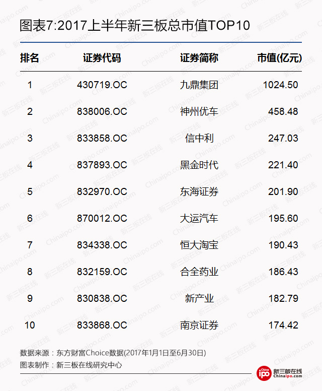2017年上半年新三板整体总市值为32004.05亿元,平均市值为2.83亿元。继续停牌的九鼎集团以1024.05亿元的总市值。仍是新三板最估值最高、也是唯一一家千亿市值的挂牌企业。