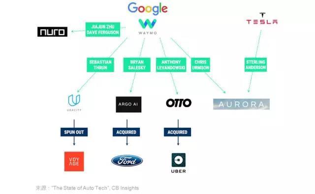 许多著名的工程师离开谷歌和特斯拉之后都在创业或在初创企业工作,因此由前谷歌和特斯拉的自动驾驶部门创建的“家族树”持续增长(下图)。Robotaxi初创公司Voyage有一个特别有趣的起源故事:其CEO Oliver Cameron是教育独角兽Udacity的VP,负责无人驾驶的课程,而Udacity则由DARPA Challenge和谷歌汽车的连续创业者Sebastian Thrun所创立。