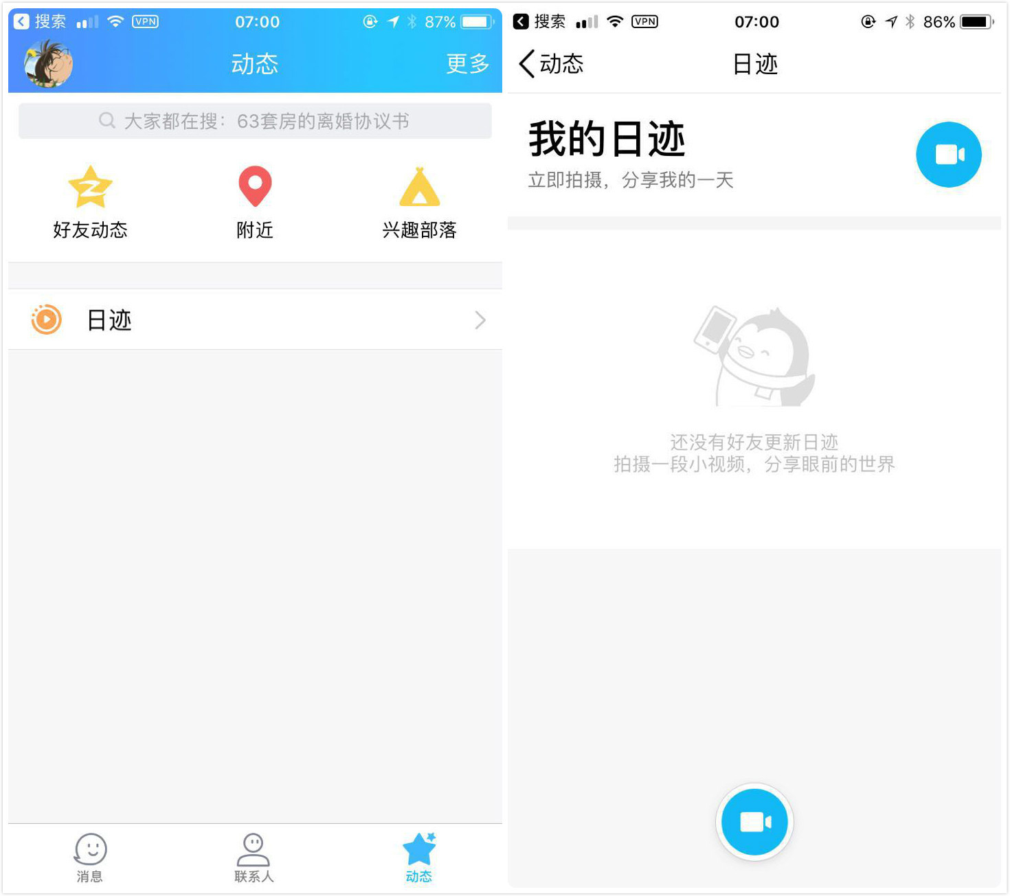 另一个代表性产品 QQ 的日迹功能也接近停摆,原来的精选频道被撤下,徒留白茫茫一片干净。