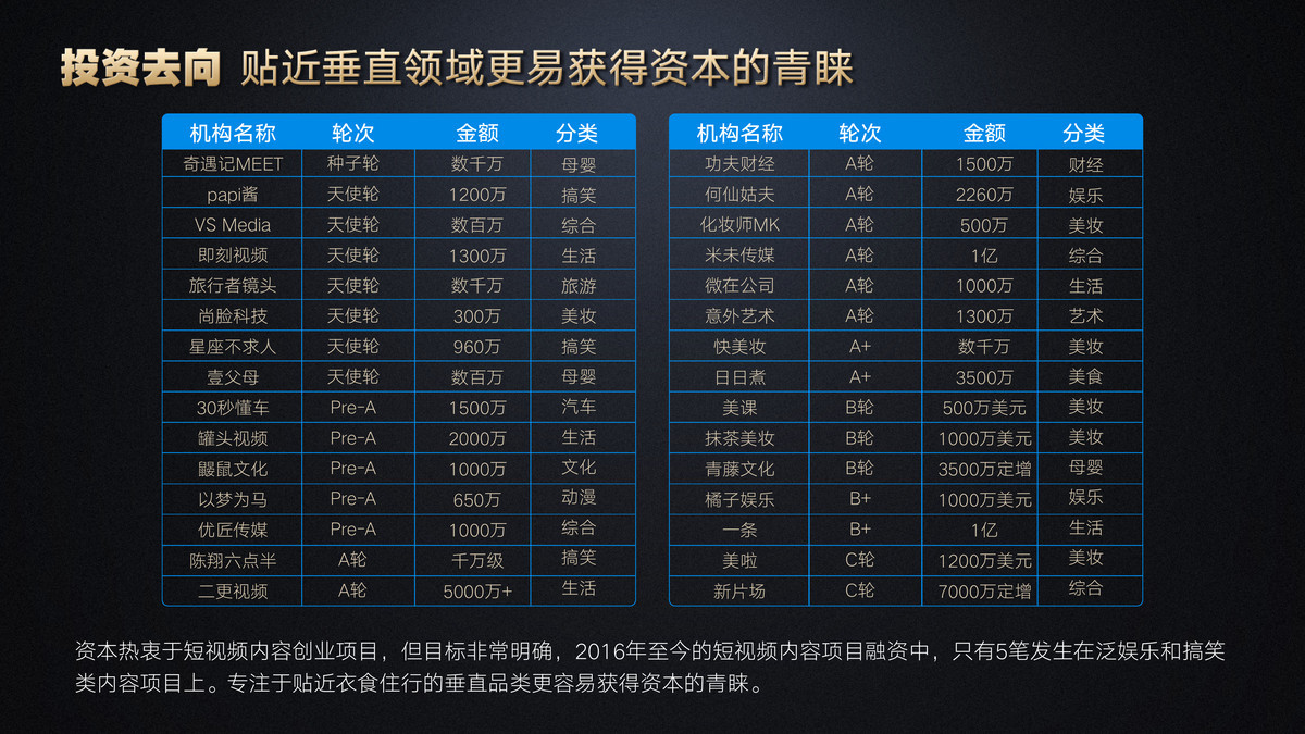 根据36氪之前的统计,光是短视频内容创业, 2016 年这个领域就有有多达 30 起融资,总融资金额高达 53.70 亿人民币;当然,如果回过头来再看真正的融资大头——短视频平台,你会发现,光算算一下科技 5 亿美金的 E 轮融资以及快手 3.5亿 美金的 D 轮,就足以让先前那个融资数字翻个番。