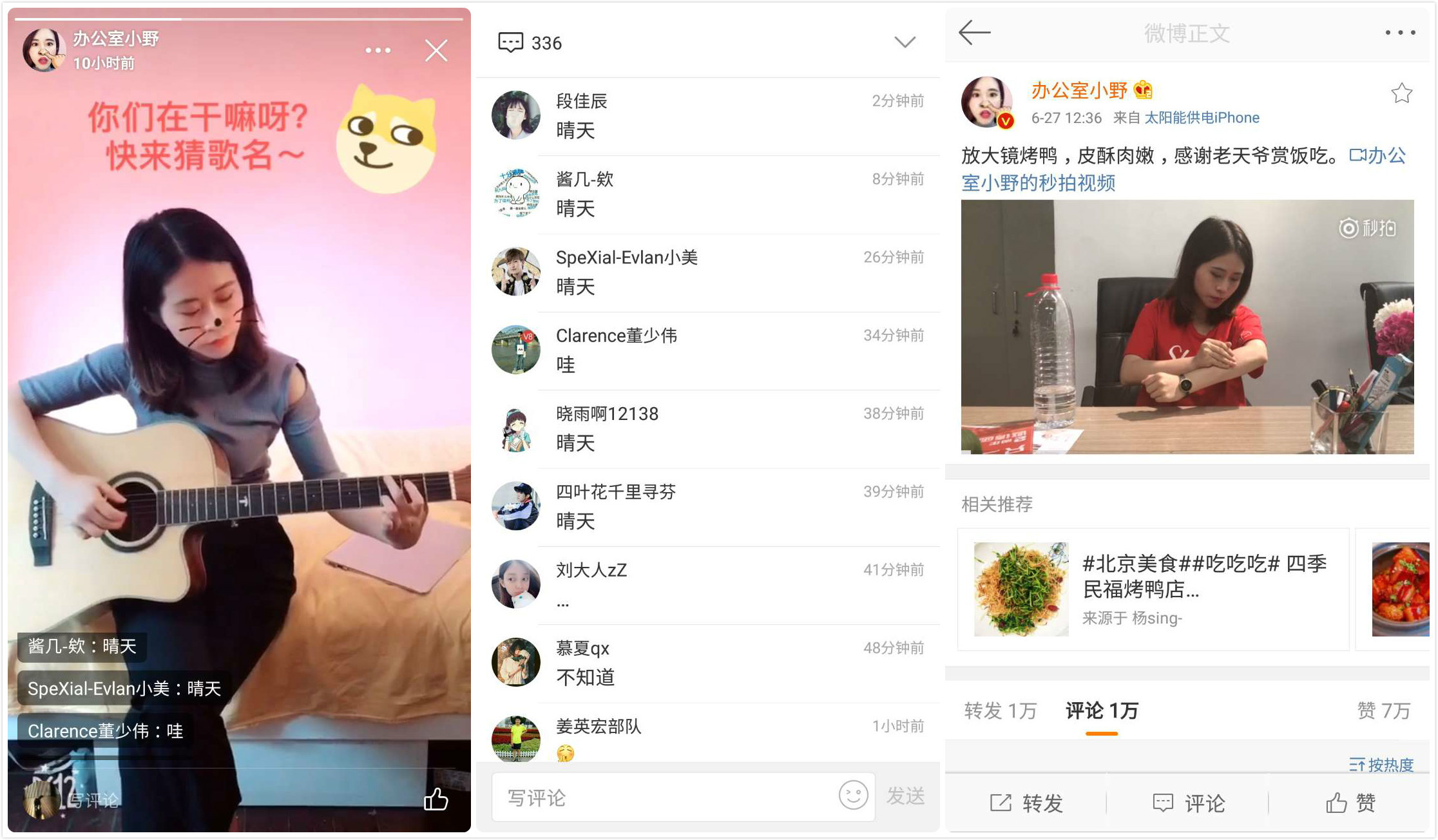 以知名美食短视频网红办公室小野为例,其最新一条“微博故事”发于 10 小时之前,评论数只有 300 多条,而正常情况下,其美食短视频的转发、评论以及点赞的数量是这个数字的数十倍。
