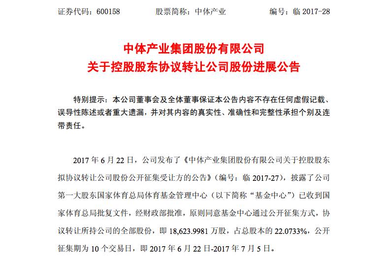 终于,到了6月21日,中体产业发布公告称,财政部原则上同意体育总局基金中心以公开征集的方式协议转让所持中体产业股份,公开征集期为10个工作日,从6月22日到7月5日。这一次的公开征集,再一次将中体产业推上风口浪尖,当日股票再次大涨。