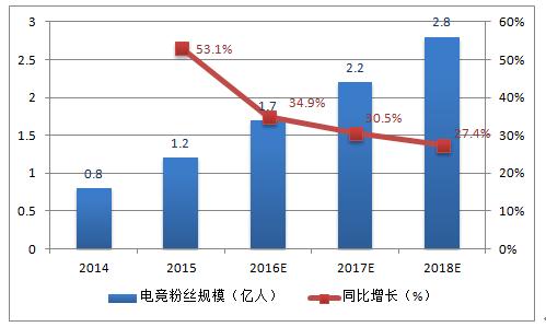 目前电子竞技行业蓬勃,智研咨询发布的《2017-2022年中国电子竞技行业深度调研及投资战略报告》称,2015年粉丝规模达到了1.2亿人,同比增长高达53.1%,预计2018年将达到2.8亿人。在粉丝规模高速增长时,国内电竞市场规模、市场渗透率也在不断上升。国内电竞市场渗透率由2014年的19.8%升至2016年的30.5%,这一切数据表明,电竞行业已经成为游戏行业的重要细分领域。