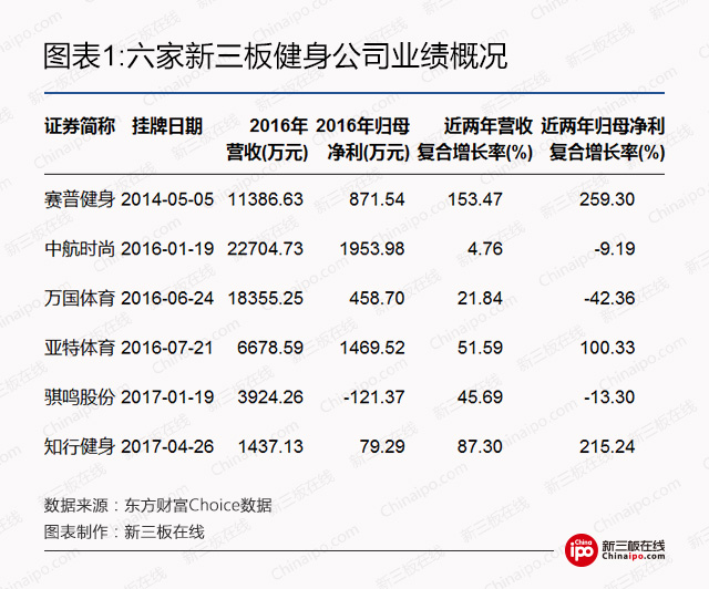 新三板在线通过东方财富Choice数据统计发现,新三板中“休闲健身”板块的公司共有六家,分别为中航时尚、亚特体育、赛普健身(430747)、万国体育(837629)、知行健身和骐鸣股份(870546)。