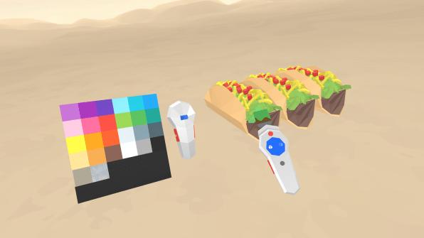“Blocks”表示块状物体,而这个app的使用方法的确和“搭积木”并没有什么区别。打开应用,用户就能左手拿着调色盘,右手握着画笔控制器。通过动作捕捉,用户能把预设的球体、圆锥体等拼成更复杂的图形,然后将它们堆叠在一起进行上色。
