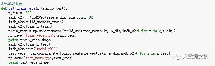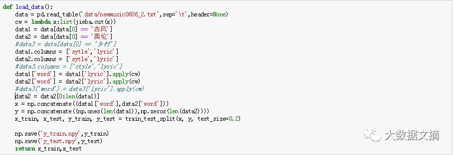 我们这里选取了第二种方案,使用word2vec对jieba拆分的单词做词义向量构建,然后将每一首歌的歌词中所包含的单词的词义向量相加并取均值,以这个最终结果向量作为该歌曲歌词的含义向量。并重新构建训练数据和测试数据。