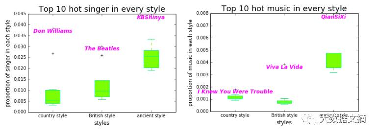 最后我们就可以用这些数据去进行一些可视化绘图,比如不同风格中最受欢迎的歌手,以及每个风格中的Top10歌曲,不同风格中歌单的平均长。