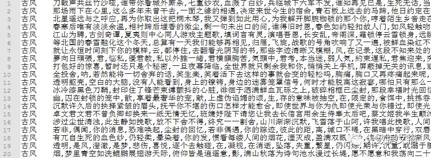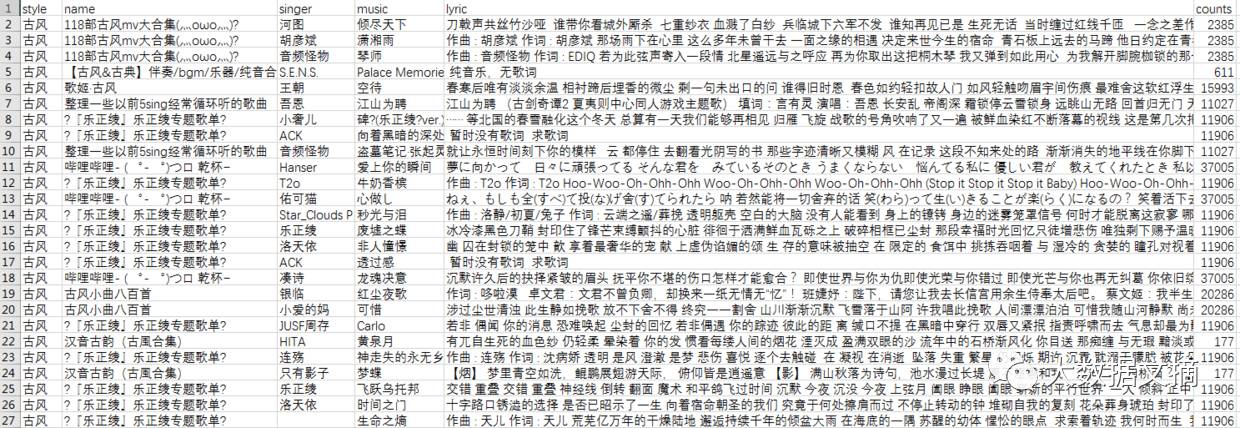 这样我们数据提取的过程就结束了,我们得到了一个.csv格式的文件输出,其中每一行就是一首歌及该歌曲的相应信息。部分截图如下: