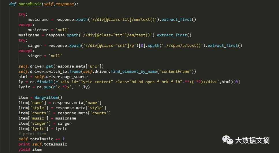 然后在解析每个music的时候,使用PhantomJS来加载歌词界面,并获得到歌词。(由于获得歌词中包含<br>等这样的Html元素标签,所以通过正则手段去掉)最终将获得到的全部信息通过Pipeline输出到文件。