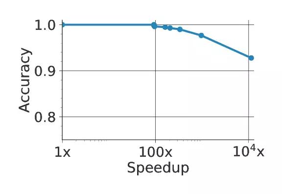 为了设置这个级联(cascade)以及每个模型的置信度,NoScope提供了可以在精度和 速度之间折衷的优化器。如果想更快地执行,NoScope将通过端到端级联传递更少的帧。如果想得到更准确的结果,NoSceop 则将提高分类决定的简化阈值。如下图所示,最终结果实现了比当前方法快10000倍的加速。